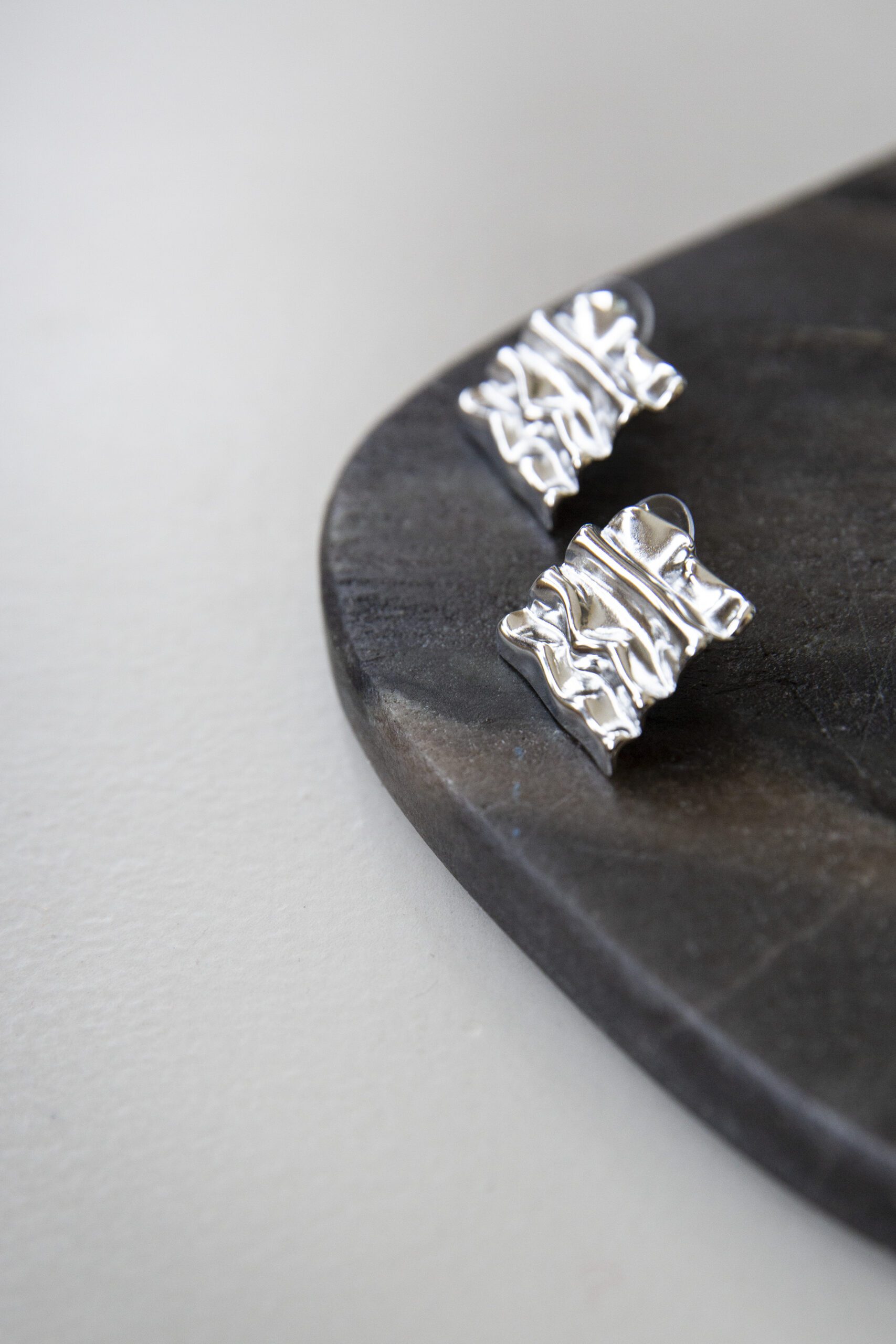 Ivy earrings feature a unique, folded design in polished silver steel, creating soft, undulating curves that catch the light beautifully. Their sculptural form evokes a sense of movement and texture, making them a standout piece of refined elegance.