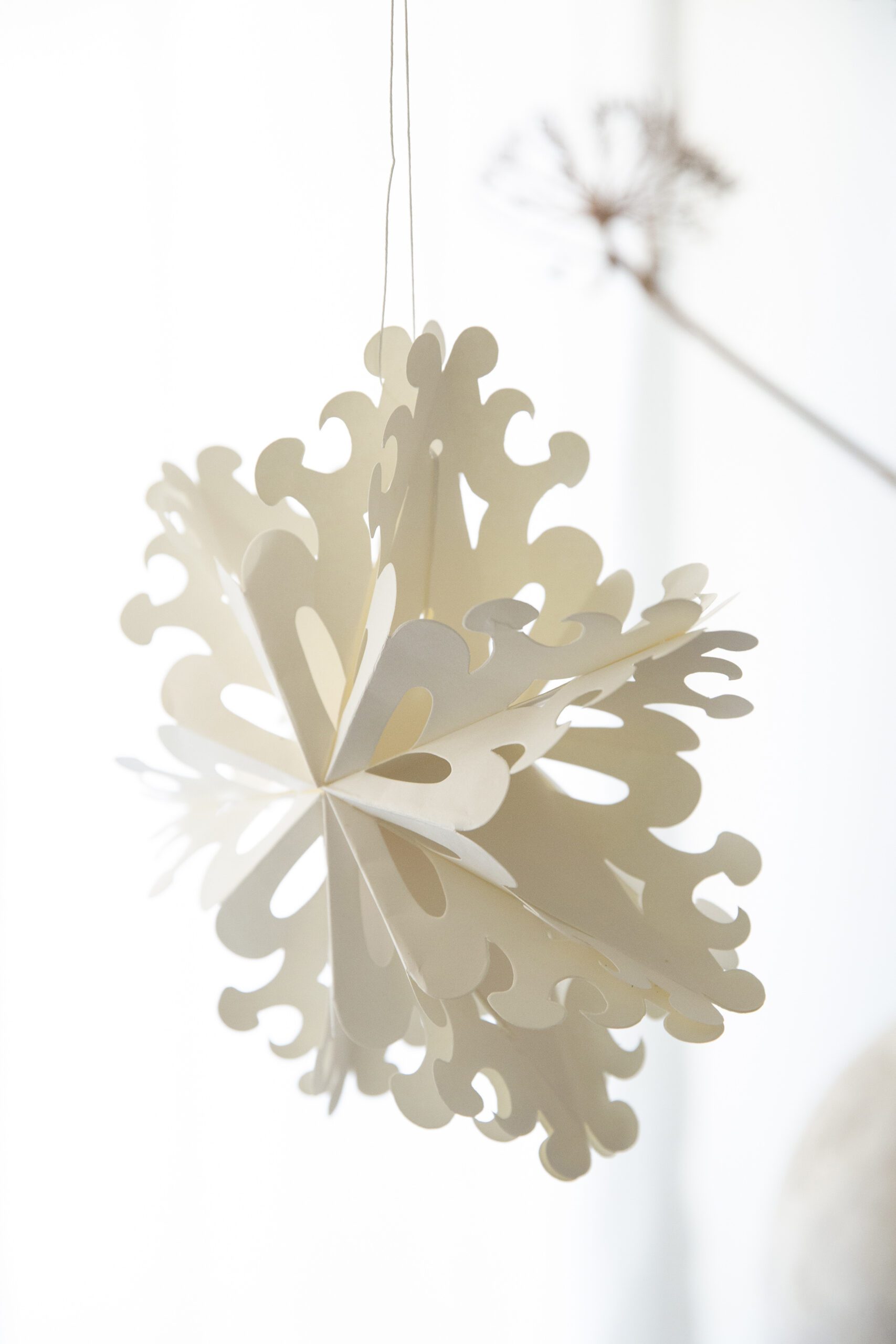 This stunning large snowflake paper decoration is machine-cut from white paper and assembled by hand. It’s an eye-catching decor piece that can be easily hung indoors. The design is identical on both sides and measures approximately 23 cm in diameter.