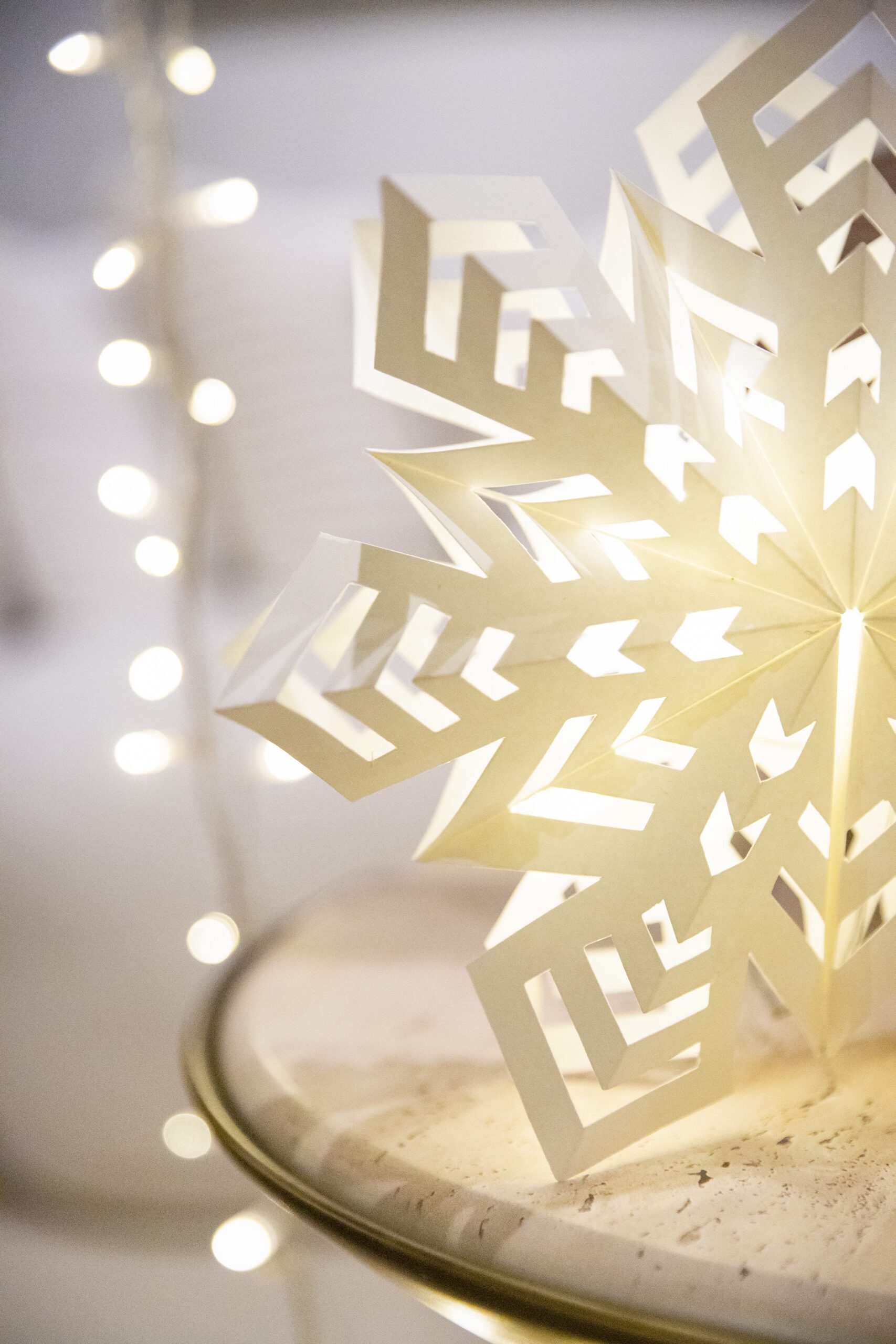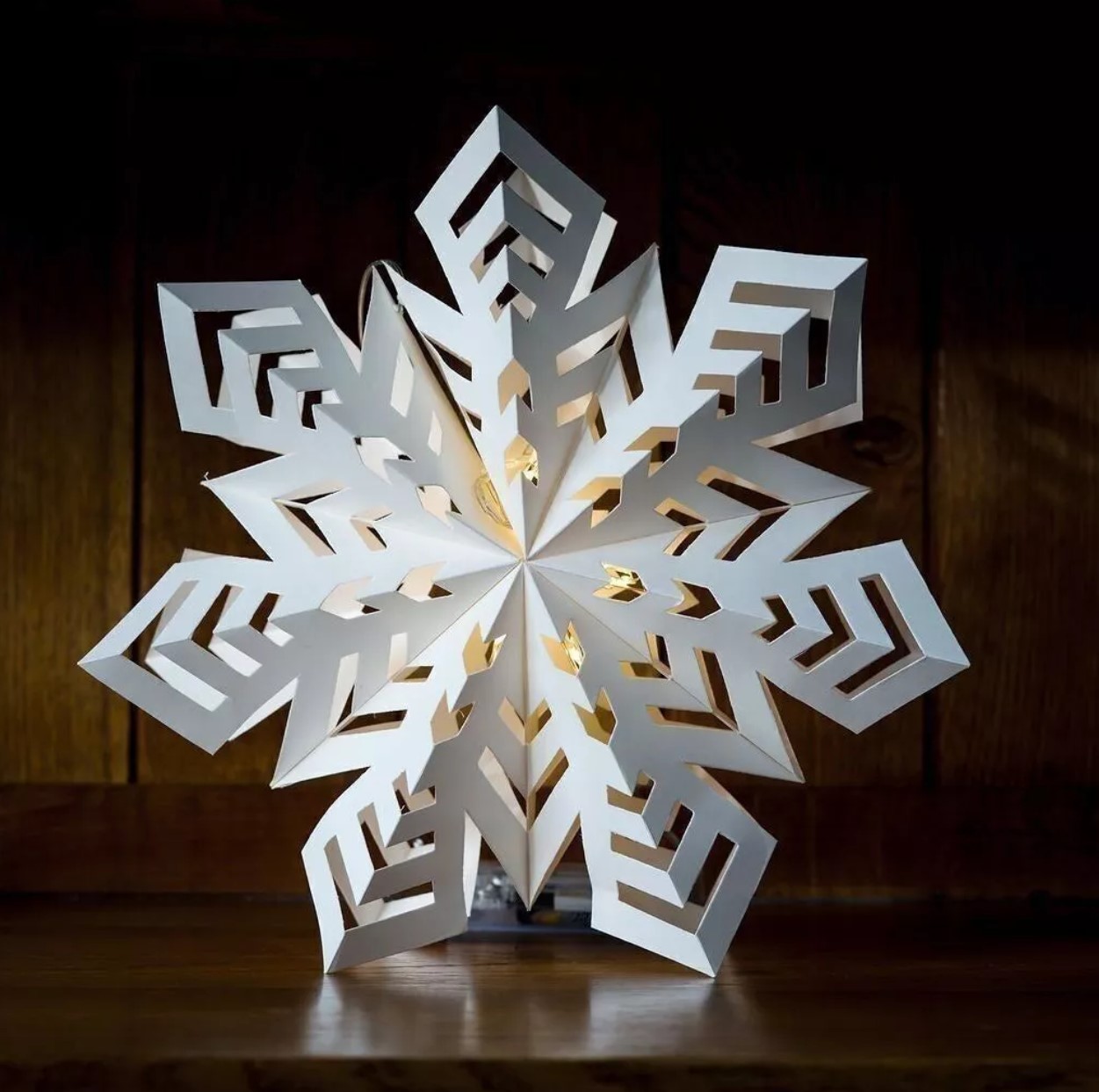 This paper snowflake is meticulously laser-cut from heavy-duty white paper. It arrives folded in a poly bag; all you need to do is take it out, unfold it, and pull the light cord tight to secure the hanging decoration.